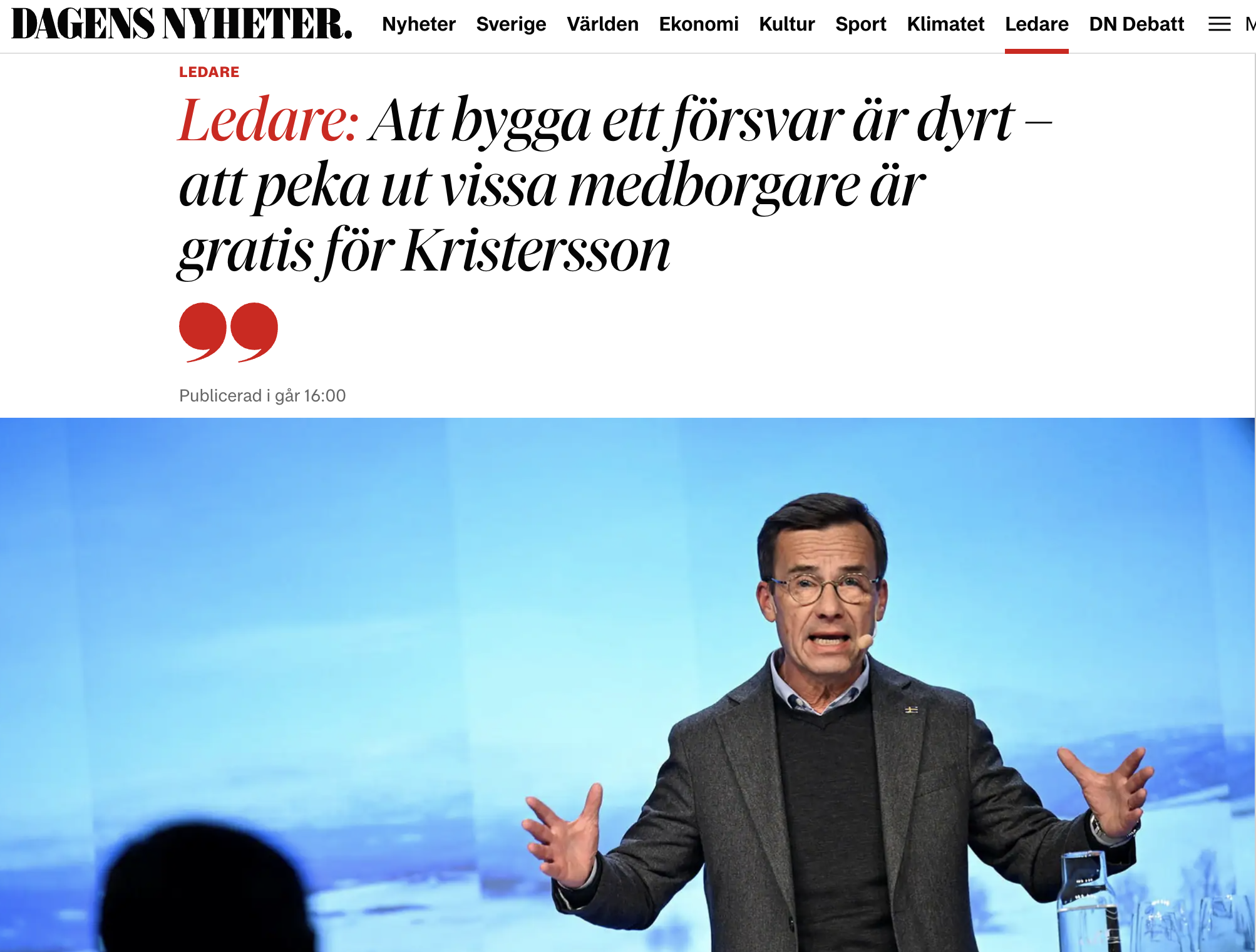 Il governo, in compenso, è allineato alle parole del generale: ieri il primo ministro, il moderato Ulf Kristersson, ha ribadito che è compito della popolazione contribuire alla difesa totale (totalförsvaret) della nazione. Ha poi attaccato quegli immigrati che prendono la cittadinanza svedese pensando di non avere alcun dovere nella difesa del paese. “La cittadinanza è per la difesa della Svezia, i nostri valori e il nostro stile di vita – con le armi in mano e la nostra vita in prima linea. La cittadinanza non è un passaporto per viaggiare”.