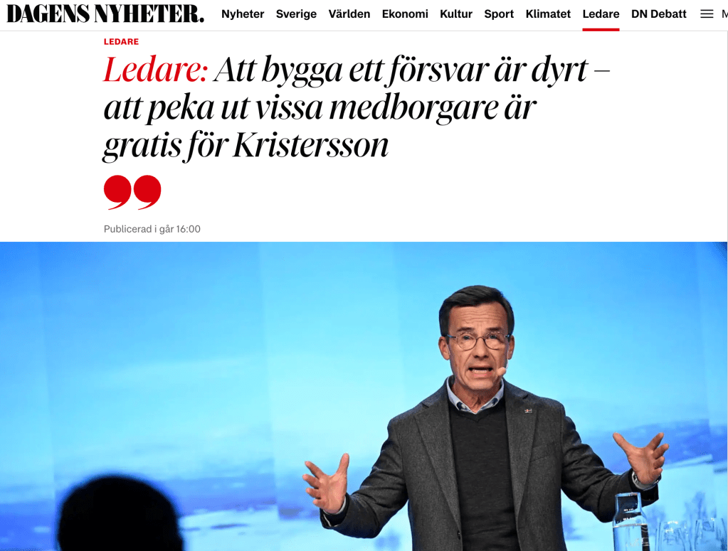 Dall’altra parte, anche il ministro della difesa, il moderato Carl-Oskar Bohlin, ha detto chiaramente che la guerra può arrivare, e che bisogna essere pronti a tutti i livelli, incluso il rischio di attacco nucleare. Tutti i cittadini vengono invitati a partecipare alla difesa civile della nazione, e le autorità, i comuni e le regioni devono lavorare per mettere in piedi organizzazioni e piani per la guerra.
